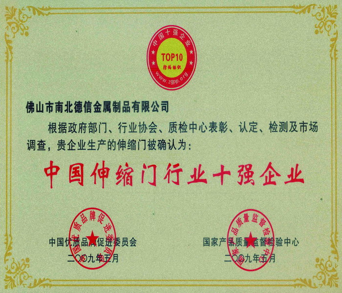喜讯:我公司荣获“中国伸缩门行业十强企业”称号!